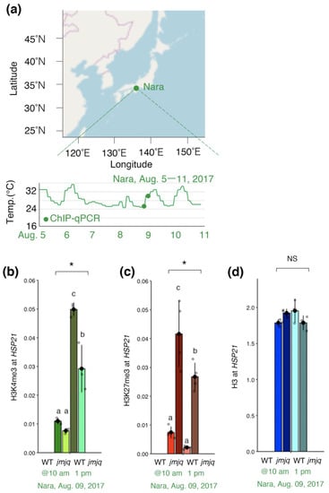 Previous studies suggested that JMJs remove H3K27me3 at the HSP22 and HSP17.6C loci not only under laboratory conditions, but also under fluctuating field conditions []. We hypothesized that JMJ activities are required for acclimation-dependent H3K4me3 association at the HSP21 locus under fluctuating field conditions as well. To examine this hypothesis, ChIP–qPCR was conducted using wild type and jmjq mutant seedlings grown under conditions that replicate those observed in Nara, Japan [] (Figure 4a).