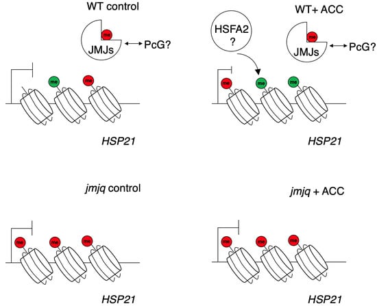 A previous study showed differences in phenotypic severity between jmjq mutants and higher-order hsp17.6c hsp22 double mutants []. Acclimation defects in jmjq mutants were stronger than in hsp17.6c hsp22 mutants. This result suggested that JMJ downstream genes other than HSP17.6C and HSP22 must exist for heat acclimation. In this study, we found that HSP21 could be such a target. It will be worthwhile to create hsp17.6c hsp22 hsp21 triple mutants to confirm the role of HSP21 during heat acclimation. Furthermore, the rescue of jmjq mutants by overexpressing HSP21 could reveal the importance of HSP21 upregulation in response to heat. JMJs mediate a balance between H3K27me3 and H3K4me3 at the HSP21 locus through proper maintenance of H3K27me3 removal during heat acclimation. In Arabidopsis, Arabidopsis trithorax (ATX) proteins play key roles [,,]. Elucidating the molecular mechanisms by which H3K4me3 levels at HSP21 are controlled by ATXs remains an exciting challenge for the future.
