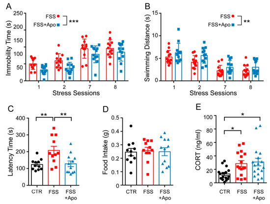 Figure 1. Apocynin prevents FSS-induced behavioral impairments. (A,B) Immobility time (A) and swimming distance (B) measured during the first and the last day of Forced Swimming Stress (FSS) exposure. Repeated two-way ANOVA. Data are presented as Mean ± SEM (n = 12 mice/group). (C,D) Novelty-Suppressed Feeding (NSF) test. Latency to bite the pellet food in a new large arena (C) and the amount of food consumed in the home cage (D). One-way ANOVA followed by Tukey’s post hoc analysis (n = 11–12 mice/group). (E) Plasmatic corticosterone levels measured 48 h after the last session of stress. One-way ANOVA followed by Tukey’s post hoc analysis. Data are presented as Mean ± SEM (n = 16–17 mice/group). * p < 0.05; ** p < 0.01; *** p < 0.001.