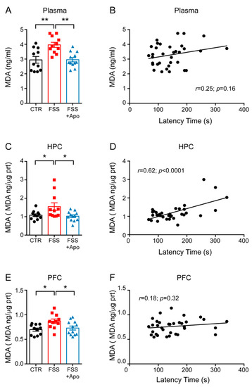 Figure 2. Apocynin prevents the FSS-induced increase of lipid peroxidation. (A,C,E) MDA levels measured in the plasma (A), hippocamps (HPC) (C) and prefrontal cortex (PFC) (E). One-way ANOVA followed by Tukey’s post hoc analysis. Data are presented as mean ± SEM (n = 11–12 mice/group). (B,D,F) Linear correlation between the latency to feed and the MDA levels in the plasma (B), HPC (D) and PFC (F). Pearson’s correlations (n = 11–12 mice/group). * p < 0.05; ** p < 0.01.