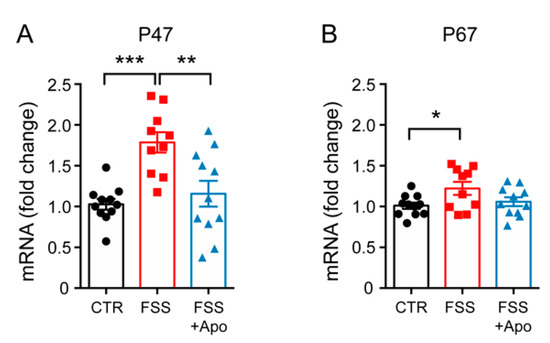 Figure 3. Apocynin prevents the FSS-induced increase of p47phox expression. (A,B) mRNA levels of p47phox (A) and p67phox (B) measured in the hippocampus (HPC). One-way ANOVA followed by Tukey’s post hoc analysis. Data are presented as mean ± SEM (n = 10–11 mice/group). * p < 0.05; ** p < 0.01; *** p < 0.001.