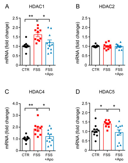 Figure 4. Apocynin prevents the FSS-induced increase of Hdacs expression. (AD) mRNA levels of Hdac1 (A), Hdac2 (B), Hdac4 (C), and Hdac5 (D) measured in the hippocampus (HPC). One-way ANOVA followed by Tukey’s post hoc analysis. Data are presented as mean ± SEM (n = 10–11 mice/group). * p < 0.05; ** p < 0.01.