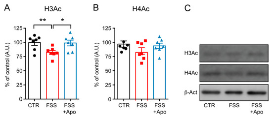 Figure 5. Apocynin prevents the FSS-induced reduction of H3 acetylation. (A,B) Levels of acetylated histone H3 (H3Ac) (A) and acetylated histone H4 (H4Ac) (B) measured in the hippocampus. Densitometric quantification were obtained as ratio of H3Ac/Actin and H4Ac/Actin. One-way ANOVA followed by Tukey’s post hoc analysis. Data are presented as mean ± SEM (n = 10–11 mice/group). (C) Representative Western blot images from H3Ac, H4Ac, and b-actin. * p < 0.05; ** p < 0.01.