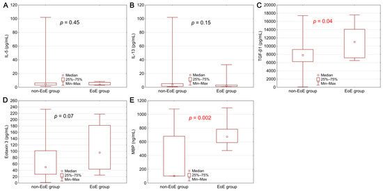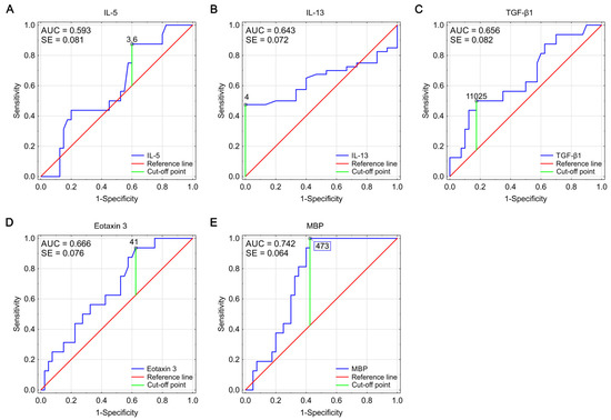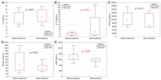 | Parameter | IL-13 | IL-5 | TGF-β1 | Eotaxin 3 | MBP | |