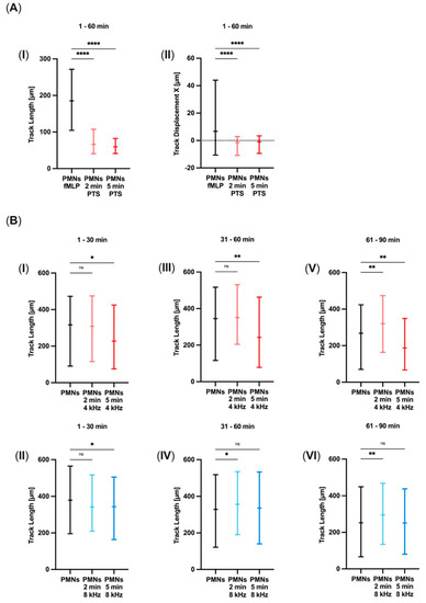 The chemo-attractive effect of PTS was tested by replacing the chemo-attractant fMLP in the left reservoirs of the 3D-µ-slide with 2 min or 5 min of 4 kHz PTS. The first 60 min of observation in the control group showed a chemotactic movement towards the chemo-attractant. However, Track Length (Figure 1A(I)) and Track Displacement X (Figure 1A(II)) were significantly decreased when fMLP was exchanged with 2 min or 5 min of PTS. These findings led to the assumption that PTS has no chemo-attractive effect on PMNs.