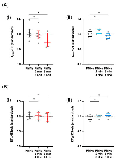 The TmaxROS of the PMNs was reduced after 5 min of direct 4 kHz CAP treatment of the PMNs compared to the control group (p = 0.0187) (Figure 2A(I)), whereas 8 kHz CAP treatment did not influence TmaxROS (Figure 2A(II)). ET50NETosis was not affected by any type of CAP treatment (Figure 2B(I,II)). The effects of 4 kHz treatment on TmaxROS were also observed in experiments using 2 min or 5 min of PTS (p2min = 0.0029; p5min = 0.0002) (data not shown).
