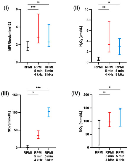 Increase in ROS and RNS concentrations in the plasma-treated solution. (I) Median fluorescence intensity (MFI) of Rhodamine123, (II) the concentration [µmol/L] of H2O2, (III) the concentration [mmol/L] of NO2−, and (IV) the concentration [mmol/L] of NO3− in RPMI 1640 dosed with 10% fetal bovine serum after 5 min of 4 kHz and 8 kHz CAP treatment (n = 4, each with 3 technical replicates) detected by fluorescence measurements. Statistical analysis: Kruskal–Wallis test. * p < 0.05, ** p < 0.01, *** p < 0.001, ns: not significant.