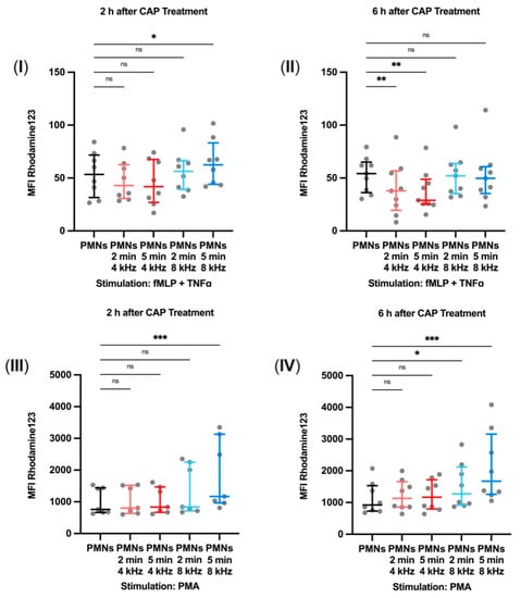 Two hours after CAP treatment, stimulation with fMLP and TNFα had significantly increased the MFI of Rhodamine123 in the 8 kHz CAP group treated for 5 min compared to the MFI of the control group (p = 0.0107) (Figure 4I). Stimulated with fMLP and TNFα and compared to the MFI of the control group, the MFI of Rhodamine123 was significantly decreased in both 4 kHz groups 6 h after CAP treatment (p2min = 0.0070; p5min = 0.0024), but 8 kHz treatment had no effect (Figure 4II). After PMA stimulation, the groups treated with 4 kHz showed no change. The group treated with 8 kHz for 5 min showed a significant increase in the MFI of Rhodamine123 2 h after CAP treatment in contrast to the control group (p = 0.0008) (Figure 4III). Both groups treated with 8 kHz showed the observed effect 6 h after CAP treatment compared to the control group (p2min = 0.0177; p5min = 0.0002) (Figure 4IV). Representative histograms of the flow cytometry data can be found in Supplementary Figure S3.