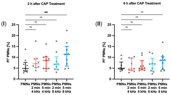 PMN membrane permeability for propidium iodide (PI) after CAP treatment. The percentage of PI-positive PMNs evaluted by flow cytometry (I) 2 h and (II) 6 h after 4 or 8 kHz CAP treatment for 2 and 5 min (n = 9). Statistical analysis: Friedman test. ** p < 0.01, ns: not significant.