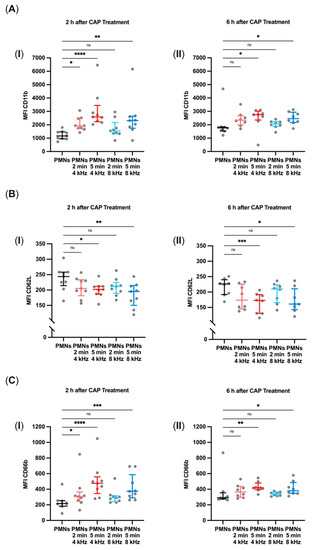CD11b expression on PMNs measured 2 h (Figure 6A(I)) and 6 h (Figure 6A(II)) after CAP treatment was only significantly increased 2 h after 4 kHz treatment for 2 min compared to the control group (p = 0.0451). In contrast, CD11b expression was significantly increased 2 h as well as 6 h after 4 kHz treatment for 5 min (p2h <0.0001; p6h = 0.0177) and 8 kHz treatment for 5 min (p2h = 0.0014; p6h = 0.0177).