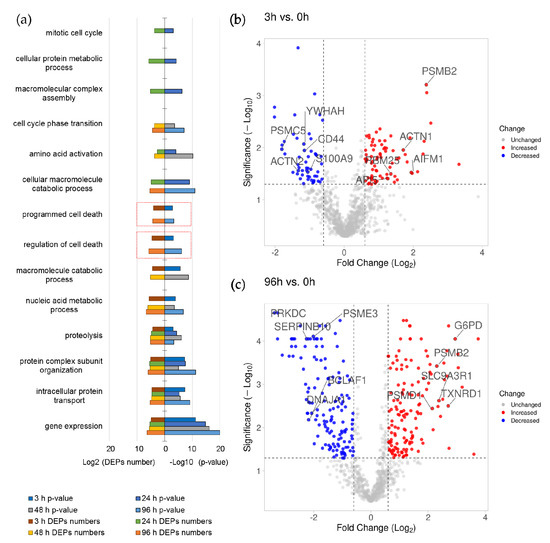 Figure 3. (a) The functional GO analysis of differentially expressed proteins (DEPs) of HL-60 cells at 3 h, 24 h, 48 h, and 96 h after ATRA treatment. The number of DEPs (Log2 transformed) and p-value (-Log10 transformed) are provided on the x-axis. The groups from the category of “Biological process” are on the y-axis. The threshold adjusted p-value < 10−4. The groups containing proteins regulating cell death and apoptosis are marked by red. The volcano plots show the differences in proteins abundance at 3 h (b) and 96 (c) after ATRA treatment; significantly up- and down-regulated proteins are shown as red and blue dots, respectively; names are shown for five most up- and down-regulated proteins that were annotated by GO belonging to groups “programmed cell death” and/or “regulation of cell death”.
