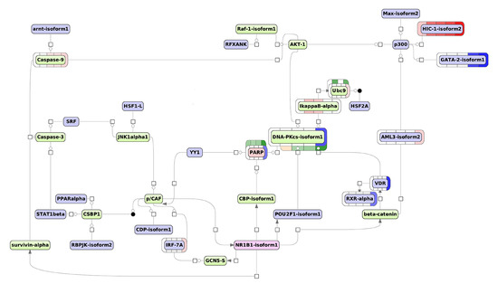 Figure 6 shows that 15 molecules, including one key molecule, five intermediate molecules, and nine transcription factors (TFs) of the transcriptome- and proteome-based model networks were characterized by the altered mRNA expression level. Transcriptional repressor HIC1 was strongly up-regulated at all time points studied suggesting its regulatory value. It is noteworthy that CASP9 and NFKBIA were up-regulated at 3 h after ATRA treatment. Transcription factors VDR and RXRA, which are intimately related to induced differentiation, were down-regulated (as well as key molecule PARP1).