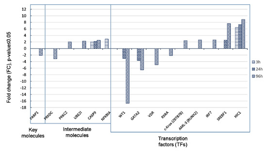 Figure 6. Components of transcriptome- and proteome-based model networks with altered mRNA expression under ATRA treatment. Transcription factors, TFs (predicted by TRANSFAC@ database), intermediate and key molecules (predicted by TRANSPATH@ database) with fold change ≥ 2 (p-value ≤ 0.05) at 3, 24, and 96 h is presented.