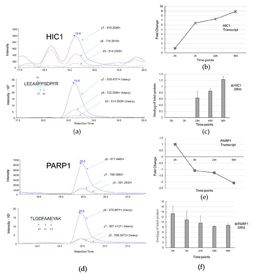 Figure 7a,d demonstrate the trace of SRM transitions for native (above) and SIS standard (below) peptides LEEAAPPSDPFR of HIC1 protein, and TLGDFAAEYAK of PARP1 protein, respectively. The Figure 7b,c show transcriptomic and proteomic profiles of HIC1 expression. Transcription repressor HIC1 was up-regulated at 3 h and its mRNA abundance gradually increased almost 9 times to 96 h. HIC1 protein has not been identified in shotgun mass-spectrometry experiment. Using SRM technique with stable isotope labeled peptide standard (LEEAAPPSDPFR) the HIC1 abundance was detected at 24 h, 48 h, and 96 h. At these time-points its concentration was 0.63 ± 0.21 fmol/µg, 0.85 ± 0.14 fmol/µg, and 1.2 ± 0.15 fmol/µg of total protein, respectively. The HIC1 protein level was increased approximately 2-fold (FC = 1.9, p-value ≤ 0.05) from 24 h to 96 h after ATRA treatment.