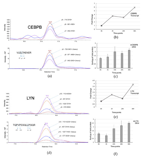 Figure 8. CEBPB and LYN expression during ATRA-induced granulocytic differentiation. (a) Trace of SRM transitions for native and stable isotope labeled peptide standard VLELTAENER of CEBPB. (b) Profile of CEBPB transcript expression during HL60 differentiation (fold change ≥ 2, p-value ≤ 0.05 at 3 h, 24 h, and 96 h) (c) Protein expression level of CEBPB obtained by SRM (three biological replicates) at 3 h, 24 h, 48 h, 96 h. (d) Trace of SRM transitions for native and standard isotopically-labeled peptide TQPVPESQLLPGQR of LYN. (e) Profile of transcript expression LYN during HL60 differentiation (fold change ≥ 2, p-value ≤ 0.05 at 3 h and 96 h). (f) Protein expression level of LYN obtained by SRM (three biological replicates) at 3 h, 24 h, 48 h, 96 h.