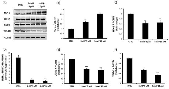 (A–C,E,F) Evaluation of SnMP (5 µM, 10 µM) effects on HO-1, HO-2, G6PD and TIGAR protein levels on A549 cells. (D) Measurement of HO enzymatic activity in A549 cells after 5 µM and 10 µM SnMP treatment (** p < 0.01, *** p < 0.001 vs. CTRL). Results are expressed as mean ± SEM.