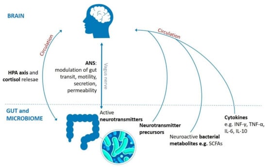 Secondly, the gut microbiome influences peripheral immune cells, which then transmit signals to the brain via cytokines [134], which play a crucial role in neurodevelopment and neuroinflammation [135,136,137]. Additionally, several studies confirm that the microbiome modulates the concentration of anti-inflammatory cytokines and lowers the levels of pro-inflammatory cytokines, e.g., interferon γ (IFN-γ) and tumor necrosis factor α (TNF-α) [138]. This effect has been demonstrated in rats supplemented with Bifidobacteria, which contributes to reduced levels of IL-6, INF-γ and TNF-α, as compared to the placebo group [12].