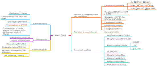 The effect of NO-related pathway on cancer is the result of many pathways being intertwined, coordinated and even antagonistic. The activity of mitogen-activated protein kinases (MAPKs), phosphoinositide 3-kinase (PI3K)/Akt, TNFα/NF-κB, IL6/STAT3, and other pathways, along with many pathway-related proteins, may induce a dual effect of NO on cancer cells (Figure 1). The activation or inhibition of these signaling pathways is correlated with the phosphorylation and dephosphorylation of related proteins and enzymes in cancer cells (Figure 1, Table A1 Appendix A).