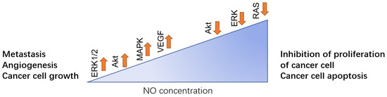 Nitric oxide was first discovered by Ferid Murad for its role in promoting cardiovascular dilation. In oncology, NO has been discussed as an oncogene in the past. However, recently, it was discovered that the proper concentration of NO has a role in the cancer cell cycle, death, metastasis, migration, and angiogenesis [67,68]. Therefore, NO and its donor drugs have been increasingly used in cancer chemoprophylaxis, radiotherapy, chemotherapy, and immunotherapy [69]. At low concentration, NO includes in the activation and phosphorylation of ERKs, Akt/mTOR, STAT and Ras signal pathway to enhance angiogenesis and metastasis and stimulate cancer cell progression. However, as an effective vasodilator, NO, is also used in delivering the antitumor drug. In this situation, narrow vessels around the tumor are dilated and blood flow increases, thus the drug can efficiently function [70]. While at higher concentration, NO intends to depress tumor development by inducing cell apoptosis, sensitizing tumors to radiotherapy, reversing resistance to chemotherapy, and declining the angiogenic and metastatic cascades [9]. Also, the study showed that ERK-P, Akt-P, and p53 are correlated with a high concentration of NO, thus inhibiting cancer progression [13].