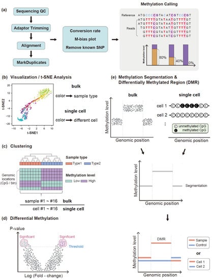 After methylation calling, subsequent analyses such as t-stochastic neighbor embedding (t-SNE) (Figure 4b) for visual analysis, cluster analysis (Figure 4c), and identification of differentially methylated cytosines (DMCs) (Figure 4d) or differentially methylated regions (DMRs) (Figure 4e) are conducted. Selection from DMCs and DMRs for certain analyses is dependent on the feature a researcher considers []. In the case of analysis focusing on DMRs, there are additional numerical values to distinguish differences between groups that summarize the methylation information in a region, including average methylation fraction (AMF) or individual methylation fraction (IMF). A recent study imported the concept of haplotype block []. This method builds a haplotype block of CpG sites, considering each CpG site as an SNP locus and the methylation status of each CpG site as B-allele frequency (BAF). To build haplotype blocks, the authors compiled WGBS data and RRBS data for various types of tissues. To explore differences between tissues, the authors suggested a new term, methylation haplotype load (MHL). This metric performed best compared to AMF and IMF for tissue classification and detection of tissue of origin for cell-free tumor DNA samples []. These various analysis methods are similarly used in single-cell analysis. As an example, two papers [,] analyzed methylation of circulating tumor cells (CTCs) and clustered single-cell groups and found DMR. Researchers can find the difference by applying the above methods even in single cells.