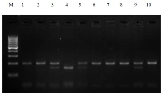 Restriction analysis of the 609C > T polymorphism in the NQO1 gene. Lane M—100 bp ladder marker; lane 1,2,6–8,10—CC genotype; lane 3,5,9—CT genotype; lane 4—TT genotype.