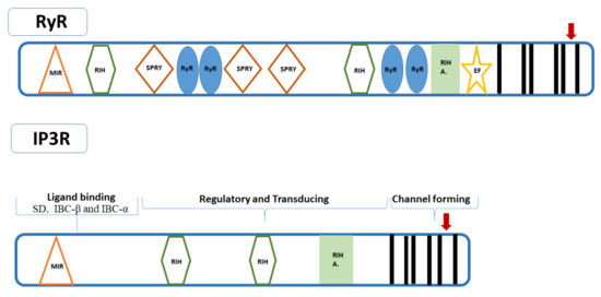 The conserved domains for RyR are listed as following MIR (Mannosyltransferase, IP3R, and RyR, pfam02815), RIH (RyR and IP3R Homology, pfam01365), the SPRY (spIA and RyR domains, pfam00622), RyR domain (pfam02026) [71,90,91,92], RIH A domains (RIH-associated, pfam08454) [89], EF-hands, and putative transmembrane domain (TM1-TM6). IP3R has three putative functional regions: ligand binding, central regulatory, and channel forming sites. Ligand binding region includes three subdomains, the IP3-binding core β (IBC-β) and α (IBC-α) that interact with IP3; and the suppressor domain (SD) reducing the affinity for IP3 [81,82,83,84,85]. The conserved domains for IP3R are listed as following MIR RIH, RIH A, and TM1-TM6. Arrow corresponding to TM5 and TM6 including the suppressor domain and ligand binding, which leads to modulation of the gating of the Ca2+ pore in both channels.