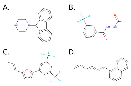 Maximum common substructures of the compounds detected during the virtual screening, split into cluster 1 with 15 molecules (A), cluster 2 with 8 (B), cluster 3 with 5 (C) and cluster 4 with 4 (D).