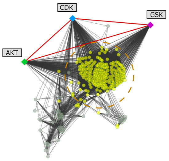 According to Figure 4, a group of the proteins, including the kinases, are in the centre of the network, where the node’s degree values are higher compared to the rest. In addition, 10 proteins, including AKT, CDK and GSK3, are directly connected with each other in the network. We illustrate in Figure 5 a subnetwork that explains the direct associations among these kinases and the synchronized regulation of a large cluster of proteins that, according to our bioinformatics analysis, are involved in the PI3K/AKT pathway.