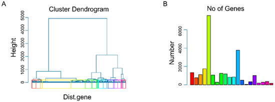 In order not to ignore the influence of gene co-expression, the 24,643 genes were firstly divided into 20 groups through hierarchical clustering analysis. Figure 2A shows the results of gene clustering, and different groups are indicated by different colors. Figure 2B shows the number of genes contained in each group, and we can see that the gene group effect is strong.