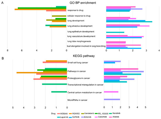 Biological process and pathway enrichment of EGFR inhibitor-responsive genes. (A) Introduce the GO database to view the predicted EGFR inhibitor-responsive gene enrichment and view which were related to the biological processes related to drugs and lungs. (B) Introduce the KEGG database to check which gene pathways related to cancer were related to the predicted EGFR inhibitor-responsive genes.