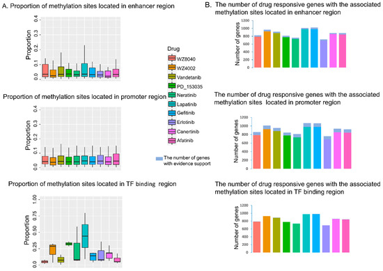 Location information of methylation sites related to EGFR inhibitor response. (A) The proportion of predicted methylation sites located in enhancer, promoter, or TF binding regions. (B) The light blue bar represents the number of responsive genes supported by evidence; that is, the methylation sites closely associated with the responsive genes were located in important regulatory regions (enhancer, promoter, transcription factor binding) for each of the 10 EGFR inhibitors, respectively.