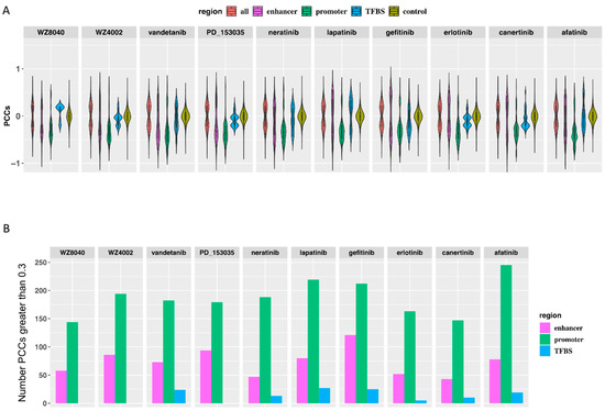 Spearman correlation coefficients between the predicted EGFR inhibitor-responsive genes and the associated methylation sites. (A) According to the location information of methylation sites, they were divided into five groups, namely, the enhancer group, the promoter group, and the TF binding group, which were located in the three regulatory groups and the control group. (B) The barplot shows the number of PCCs related to enhancer, promoter, and TF binding regions greater than 0.3.