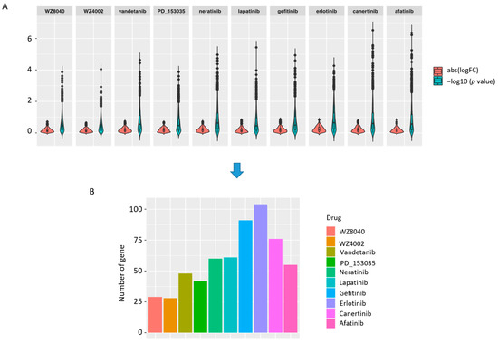 Results of difference analysis. (A) The violin plot shows the absolute value of logFC and −log10(p value) for each EGFR inhibitor. (B) The number of absolute value of logFC > 0.5 and the p value < 0.05 for each EGFR inhibitor.
