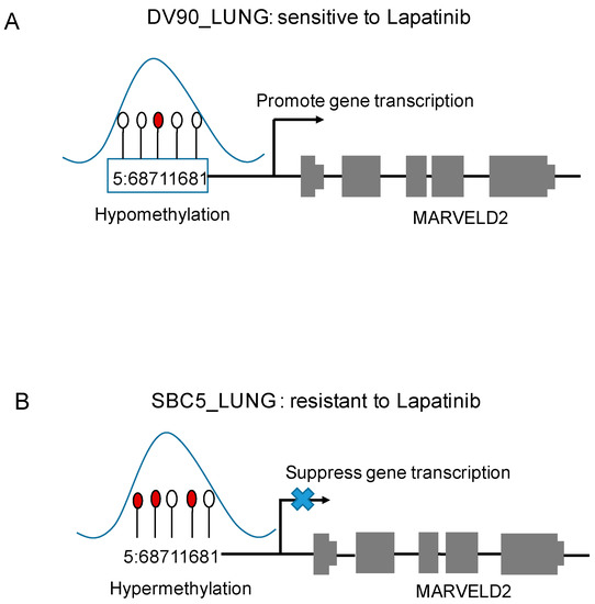 The relationship between methylation and gene expression. (A) In lung cancer samples sensitive to Lapatinib (DV90_LUNG), methylation site—5:68711681 hypomethylation may promote the transcription of MARVELD2 gene. (B) In lung cancer samples resistant to Lapatinib (SBC5_LUNG), methylation site—5:68711681 hypermethylation may suppress the transcription of MARVELD2 gene.