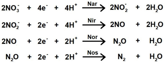Briefly, two nitrate ions are sequentially reduced to N2 in a series of four oxidation-reduction reactions catalysed by four metalloenzymes known as respiratory nitrate reductase (Nar), respiratory nitrite reductase (Nir), nitric oxide reductase (Nor) and nitrous oxide reductase (Nos) [4]. In this process, a total of 10 electrons are transferred to nitrogen oxides to complete their reduction to dinitrogen [4]. The presence of a total or partial set of denitrification enzymes determines whether a microorganism is classified as complete or incomplete denitrifier, respectively [5,6,7,8].