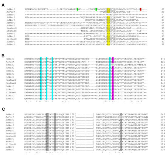 Clustal omega alignment of Azospira oryzae (AoPcrA; Protein NCBI ID: WP_014235273.1), Escherichia coli (EcNarG; Protein NCBI ID: WP_000032939.1), Halococcus salifodinae (HsNarG; Protein NCBI ID: EMA48671.1), Halorhabdus utahensis (HuNarG; Protein NCBI ID: WP_012795090.1), Haloferax mediterranei (HmNarG; Protein NCBI ID: WP_004056332.1), Halogeometricum pallidum (HpNarG; Protein NCBI ID: WP_008385261.1), Halosimplex carlsbadense (HcNarG; WP_006885135.1), Haloarcula marismortui (HmaNarG; Protein NCBI ID: WP_011223493.1), Halomicrobium mukohataei (HmuNarG; Protein NCBI ID: WP_015763420.1), Halogranum amylolyticum (HaNarG; Protein NCBI ID: WP_089826390.1), Halorientalis regularis (HrNarG; Protein NCBI ID: WP_092694237.1), Halorubrum lipolyticum (HliNarG; Protein NCBI ID: WP_008003395.1), Halobellus limi (HlNarG; Protein NCBI ID: SEF60617.1), and Salinigranum salium (SsNarG; Protein NCBI ID: WP_152042447.1). (A) N-terminal signal peptide region. The TAT consensus sequence [ST]RRxFLK is underlined, twin arginine ‘RR’ is represented in yellow, hypothetical start codons and the first amino acid of mature of Haloferax mediterranei NarG are shown in green and red, respectively. (B) Metal-coordinating regions of FS0 cluster. His and Cys residues involved in FS0 cluster coordination are highlighted in cyan whereas Lys involved in a possible electron transfer pathway between FS0 and MoCo cofactor are rendered in magenta. (C) NarG active site. The conserved residues involved in catalytic mechanism are highlighted in grey.