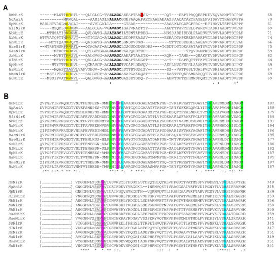 Clustal omega alignment of Neisseria gonorrhoeae (NgAniA; Protein NCBI ID: WP_003705926.1), Ralstonia pickettii (RpNirK; Protein NCBI ID: WP_039373687.1), Halorubrum lipolyticum (HliNirK; Protein NCBI ID: WP_049911241.1), Natonolimnonius barhuensis (NbNirK; Protein NCBI ID: WP_054863730.1), Natronococcus amylolyticus (NaNirK; Protein NCBI ID: WP_005555322.1), Halobiforma haloterrestris (HhNirK; Protein NCBI ID: WP_089787040.1), Halopiger aswanensis (HasNirK; Protein NCBI ID: WP_120243376.1), Haloplanus aerogenes (HaeNirK; Protein NCBI ID: WP_121921915.1), Salinigranum salinum (SsNirK; Protein NCBI ID: WP_152041973.1), Halobellus limi (HlNirK; Protein NCBI ID: WP_103992402.1), Haloferax mediterranei (HmNirK; Protein NCBI ID: WP_004059594.1), Halogeometricum pallidum (HpNirK; Protein NCBI ID: WP_049916781.1), Halogranum amylolyticum (HaNirK; Protein NCBI ID: WP_170864849.1), Haloarcula marismortui (HmaNirK; Protein NCBI ID: WP_011224471.1), Halorhabdus utahensis (HuNirK; Protein NCBI ID: WP_012795101.1). (A) N-terminal signal peptide region. The TAT consensus sequence [ST]RRxFLK is underlined, twin arginine ‘RR’ is represented in yellow, lipoprotein consensus sequence is in bold and the first amino acid of the mature protein in Haloferax mediterranei is highlighted in red. (B) T1Cu and T2Cu coordination centres and catalytic amino acids. The catalytic amino acids are highlighted in magenta, whereas amino acids involved in T1Cu and T2Cu coordination centres are highlighted in green and cyan, respectively. The consensus sequence SSFHV/I/P is underlined.