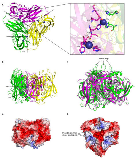 The physiological electron donors to NirK in Haloferax mediterranei is still unknown. It could be a halocyanin that it is encoded in the proximity of NirK [6]. In Figure 6D,E is represented the electrostatic potential of the trimer and possible areas of interaction with the electron donor can be identified.
