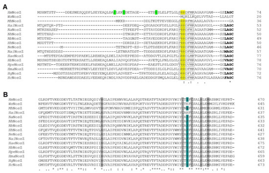 Two approaches were used to select relevant species to conduct the alignment of the sequences: i) Sequences coding for the enzymes in at least one organism from which the enzymes have been structurally characterized were included in all the alignments analysed; ii) Sequences coding for the enzymes of denitrification in species described as complete denitrifiers were included (two haloarchaea species from each family (this classification is according to Taxonomy NCBI Database). After species selection, the alignments of the sequences were performed using Clustal Omega software (https://www.ebi.ac.uk/Tools/msa/clustalo/, accessed on 18 June 2020.). This bioinformatic tool is based on the HHalgorithm described by Söding [26,27], and for these alignments default parameters were used.