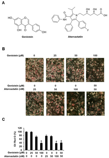 Inhibitory effects of genistein and atorvastatin on adipogenesis in 3T3L-1 preadipocytes. (A) Chemical structure of genistein and atorvastatin. (B) Images of the Oil Red O staining of differentiated 3T3L-1 cells photographed under an inverted microscope with 20X magnification on day 8 after treatment with genistein and/or atorvastatin. (C) Quantification of Oil Red O staining expressed as the percentage of the untreated control (n = 3 independent experiments, * p < 0.05, Kruskal–Wallis nonparametric test). Data are the mean ± SEM.