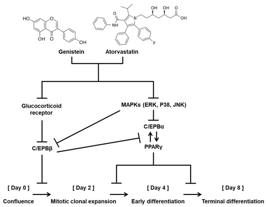 The 3T3-L1 mouse preadipocyte cell line was purchased from the American Type Culture Collection (Manassas, VA, USA). Dulbecco’s modified Eagle’s medium (DMEM) was obtained from Cellgro (Manassas, VA, USA). Fetal bovine serum (FBS), penicillin/streptomycin (P/S) antibiotics, and bovine calf serum (BCS) were purchased from Gibco (Gaithersburg, MD, USA). The EZ-Cytox cell viability assay kit, a tetrazolium salt (WST-1)-based colorimetric assay kit, was purchased from Daeil Lab Service (Seoul, South Korea). Phosphate-buffered saline (PBS), 1-methyl-3-isobutylxanthine (IBMX), Oil Red O solution, isopropanol, dexamethasone, formaldehyde solution, insulin, genistein, and atorvastatin were purchased from Sigma-Aldrich (St. Louis, MO, USA). Primary antibodies, including phospho-ERK (P-ERK), ERK, phospho-JNK (P-JNK), JNK, phospho-P38 (P-P38), P38, PPAR-γ, C/EBP-α, C/EBP-β, GR, glyceraldehyde 3-phosphate dehydrogenase (GAPDH), and horseradish peroxidase (HRP)-labeled anti-rabbit secondary antibodies were purchased from Cell Signaling Technology (Danvers, MA, USA). The ECL Plus Western blotting detection reagents were purchased from GE Healthcare (Piscataway, NJ, USA).
