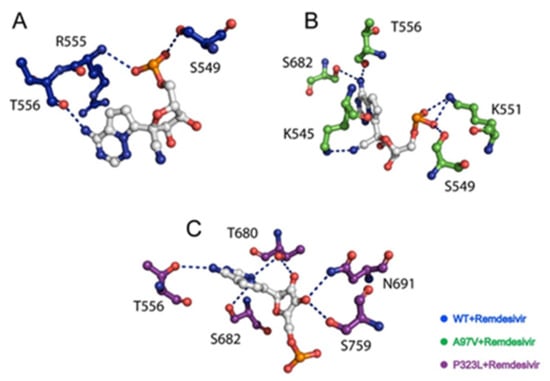 The RdRp binding site was comprised of residues K545, S549, K551, T556, T680, S682, and N691 S759. In the current analyses, RDV formed three H-bonds with S549, R555, and T556, with WT-RdRp, similar to the recent structural studies showing that RDV interacts with residues bound with S549 and R555. R555 H-bonding with RDV, in particular, has been observed in recent modeling studies. As for A97V-RdRp, RDV complex forms H-bonds with K545, S549, K551, T556, and S682. The NTP entry channel is formed by a set of hydrophilic residues, including K545, R553, and R555. In this nsp12 region, the K545 and R555 side chains interact with the primer strand RNA at the +1 base, thus stabilising the incoming nucleotide in the correct position for catalysis. The H-bonding structure of RDV in P323L-RdRp is slightly different where it interacts with T556, S759, T680, S682, and N691. Structural analysis has shown that residues S682 and N691 are involved in 2′OH recognition of the incoming nucleotide [28]; therefore, the binding of RDV to S682 and N691 in the P323L-RdRp structure may block recognition of the incoming nucleotide. In addition, residue T680, which is not present in other RdRp enzymes, plays a role in pulling the nucleotide deeper into the active site pocket [28,64]. Therefore, H-bond formation with RDV in the P323L-RdRp structure may hinder incoming NTP binding.