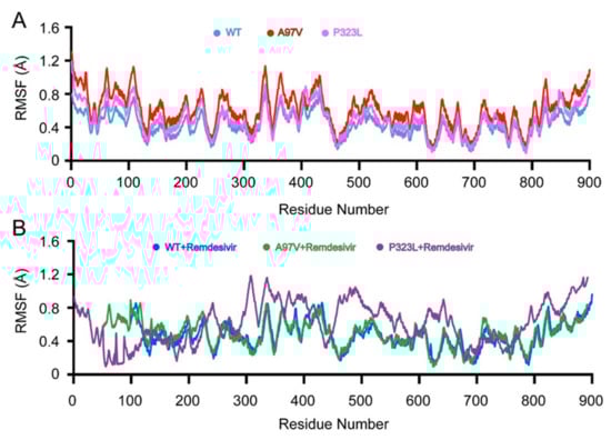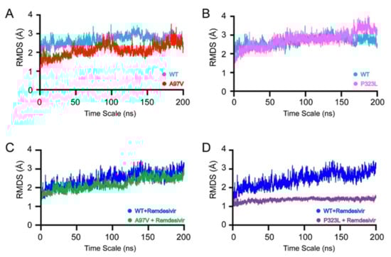 The RdRp structure comprises three non-structural proteins, nsp12, which is the major component of the replication and transcription cycle, and nsp7 and nsp8, as co-factors. Mutation studies on nsp7 and nsp8 co-factors have demonstrated in interaction with nsp12 being disrupted, resulting in the diminished activity of RdRp [22,56]. However, in this study, mutations A97V and P323L are present in nsp12 and were far from the residues interacting with nsp8 and nsp7. In addition, the RMSD (Figure 3A,B) and RMSF (Figure 4A) of WT RdRp-A97V and P323L showed no effect of mutations on the overall structure and internal dynamics of the RdRp complex. As such, in this study, nsp7 and nsp8 co-factors were not removed from the RdRp complex and test RDV binding.