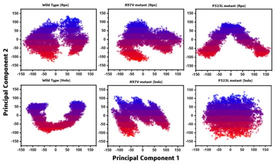 Principal component analyses (PCA) were plotted against each other; Apo WT, A97V and P323L RdRp and WT-RD, A97V-RDV and P33L-RDV RdRp complex.