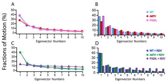 Furthermore, PCA was used to detect the high amplitude of motion of -WT-RdRp, A97V and P323L-RdRp mutant systems in apo and in complex with RDV. Therefore, the percentage fraction of motions of each eigenvector were plotted and are presented in Figure 6. The percentage fraction of motions by every single eigenvector to the total fraction of motions are shown in Figure 6B,D. In addition, the precise contribution of each vector is tabulated in Table 2. In the case of the apo WT, A97V and P323L-RdRp structures (Figure 6A), the first three eigenvectors show significant dominant motions, indicating significant fluctuations, while the remaining eigenvectors showed a localised fluctuation in each complex. In WT and P323L-RdRp apo structures, the first three eigenvectors contributed a 70% variation, while in A97V-RdRp, the first three eigenvectors showed a 60% variation. When in complex with RDV, the WT and A97V-RdRp structures showed the same pattern, whereby the first three eigenvectors contributed to 70% of the variation. In the case of the P323L-RDV complex, no motion was detected, indicating only localised fluctuation in the system. Concurrent with RMSD and MMGBSA analyses, the strong binding between RDV and P323L-RdRp mutant stabilised the protein structure. As such, the eigenvectors showed that the P323L-RdRp that bound to RDV contributed to a 13% variance in comparison to WT-RdRp and A97V-Rdrp (Figure 6C). Therefore, the overall interaction of P332L-RdRp with RDV may have only perturbed the internal motions of the structure, with such energy subspaces affecting the behaviour of the binding [53].