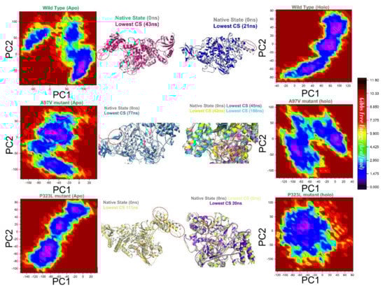 Free energy landscape (FEL) is represented as a function of PC1 and PC2. Projections of motions in the phase space at 300 K of RdRp WT−apo, A97V−apo, P323 L−apo, WT−RdV, A97V−RDV, P323L−RDV are shown. The first and second PC modes from the PCA of the backbone carbon atom fluctuations were used.