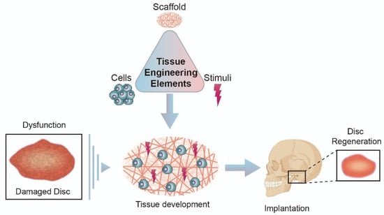 TE is a very promising field for disc regeneration, especially if it is at an early stage [21]. Through this, solutions can be found for disc replacement or regeneration or alternatively to the replacement of structures in the TMJ [40]. Traditionally, the principal elements of TE are cells, stimuli, and scaffolds [16].