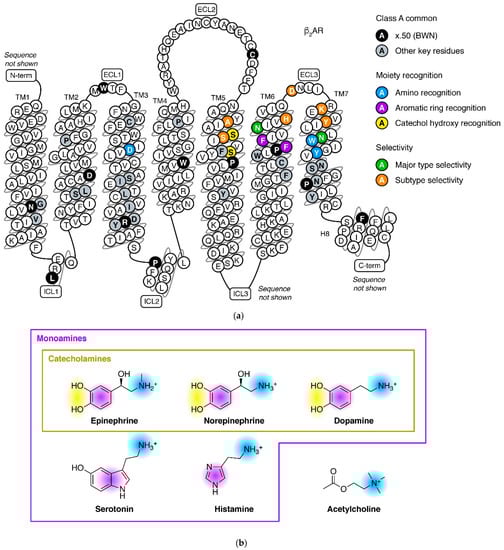 Mechanisms of ligand recognition by adrenergic receptors. (a) Key residues for protein structure maintaining, receptor activation, and endogenous ligand recognition, marked with color on snake plot of β2AR. x.50 are Ballesteros–Weinstein numbering (BWN) [22] of the most conserved residues in each segment. Sequence of N-terminus, ICL3, and C-terminus are not shown because these regions do not contain key residues and are very long. (b) Chemical structures of monoamine neurotransmitters (shown in protonated state) and acetylcholine. Moieties colored in consistent with interacting residues in panel (a).