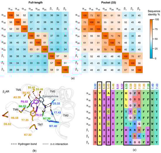 The nine adrenergic receptors in human body can be classified into three major types: α1, α2, and β, each having three subtypes. Members within a major type are highly similar in sequence and function, but in different major types are distinct in these aspects (see next section for detail). All the adrenergic receptors belong to the aminergic receptor subfamily, which has 42 members, forming a single clade in the phylogenetic tree of GPCRs [18,19,20,21]. The aminergic receptors bind monoamine neurotransmitters, acetylcholine, or trace amines, and share common features in sequence, structure, and function (Figure 2): in the orthosteric site (binding site of endogenous ligand), a conserved D3.32 (Ballesteros–Weinstein numbering, BWN [22]) forms a salt bridge to the positively charged amino group in ligand, and Y7.43 and W7.40 stabilize this salt bridge through a hydrogen bond and π-π interactions (Figure 3b). Because of the shared ligand recognition mechanism, polypharmacology (drugs interacting with multiple targets) is common in aminergic receptors. For example, ergotamine (an alkaloid produced by fungus) can bind to 22 aminergic receptors with Ki less than 1 μM [23]. Other notable cases include clozapine [24] and apomorphine [25]. Therefore, selectivity is a major concern in drug discovery against aminergic receptors.
