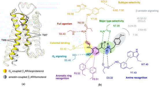 Many βARs ligands in clinical use are partial agonists, which do not produce a full response, even at high concentration. NMR [84,93,94], single-molecule fluorescence resonance energy transfer [95], and double electron–electron resonance [94,96] results showed that partial agonists induce a smaller shift of conformational equilibrium of TM6, compared to full agonists. A well-identified key interaction affecting ligand efficacy (ratio of maximal response of the ligand to full response) is a hydrogen bond to N6.55 by a full agonist, but not a partial agonist (Figure 5b). Mutations of N6.55 and S5.43 (which forms hydrogen bond to N6.55) in β2AR reduce the efficacy of full agonist isoproterenol, strongly supporting that this hydrogen bond network is crucial to the full activation of βARs [70]. All full agonists can form a hydrogen bond to N6.55, either by 3-hydroxy in catechol (like epinephrine [31,43] or isoproterenol [54,66]) or groups mimicking catechol (such as formoterol [11] or BI-167107 [8,43,90]). Most partial agonists cannot form this hydrogen bond for replacement of the 3-hydroxy, including salmeterol [70], salbutamol [54,69], xamoterol [54], and clenbuterol. However, this cannot explain dobutamine, a partial agonist of β1AR and β2AR, reserving the catechol moiety and forming a hydrogen bond with N6.55 [54]. Therefore, there may be other receptor–ligand interactions affecting ligand efficacy to be discovered. NMR experiments showed that in β2AR, the chemical shift of M2.53 depends on the efficacy of the ligand [97], and dobutamine’s direct contact with TM2 (at 2.61, 2.64, and 2.65). Whether this is the basis of partial agonism of dobutamine remains to be investigated.